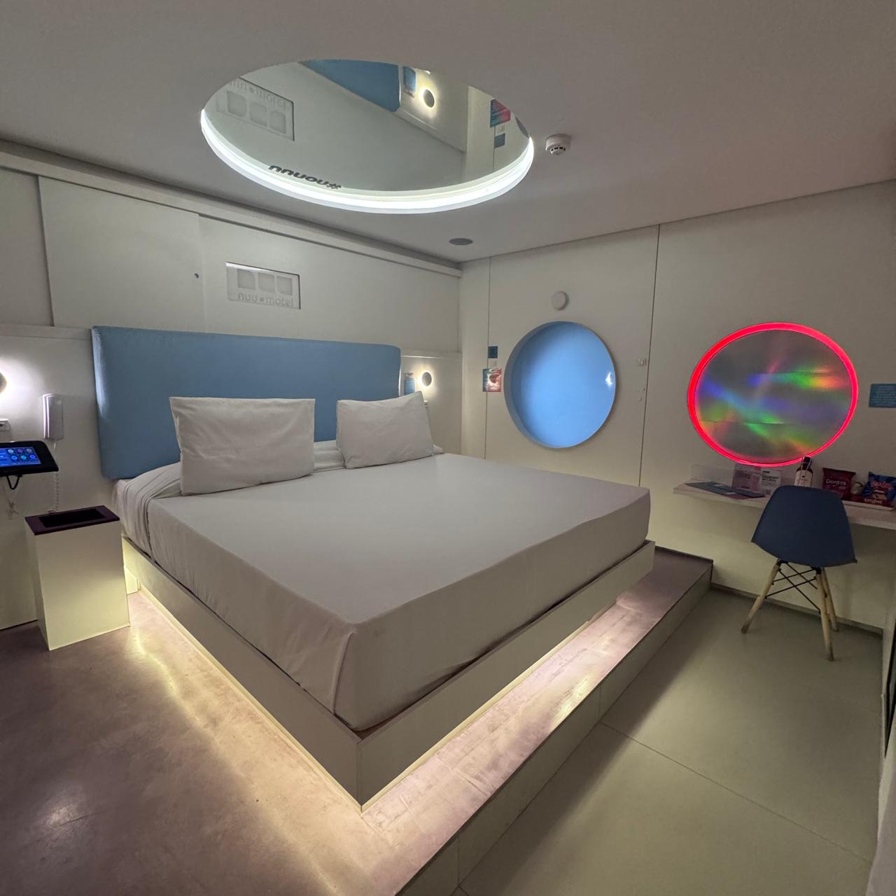 A suíte nuu.céu é toda perfeitinha. Nossa inspiração foi criar um cenário e estímulos de luzes inusitados que fossem um tanto futurista e outro tanto sensual. Buscamos referências plásticas lá no minimalismo americano, sugando o que podíamos de artistas como Dan Flavin e James Turrel. Lá em cima, na nossa Sala de Banho, temos uma banheira belíssima para ser aproveitada a dois, mas também quem sabe a um, em um dia relax. O importante é aproveitar os reflexos e todas as possibilidades de jogos de luz que o quarto oferece: não tenha medo de mexer no painel automatizado e descobrir o próprio cenário preferido.